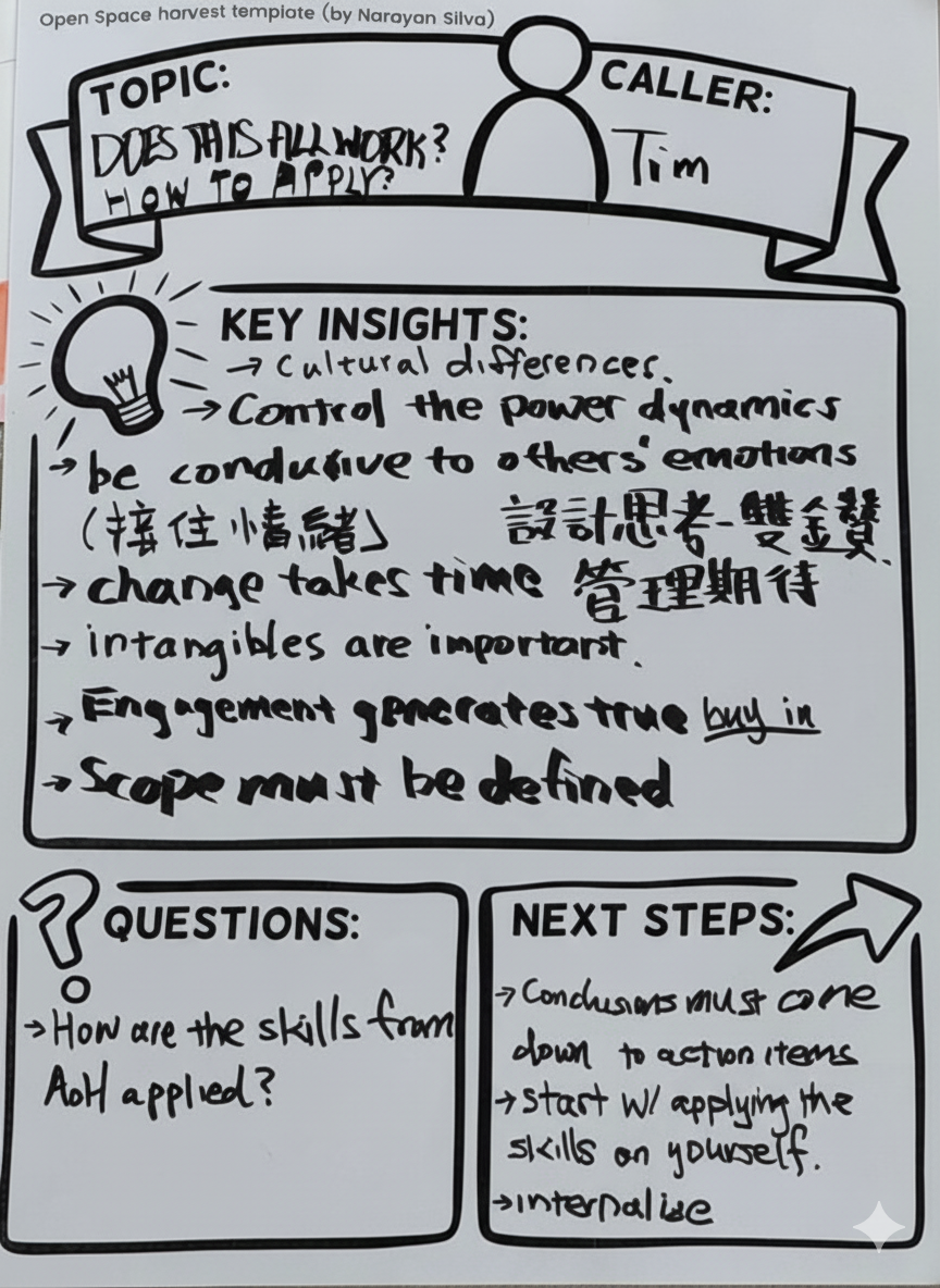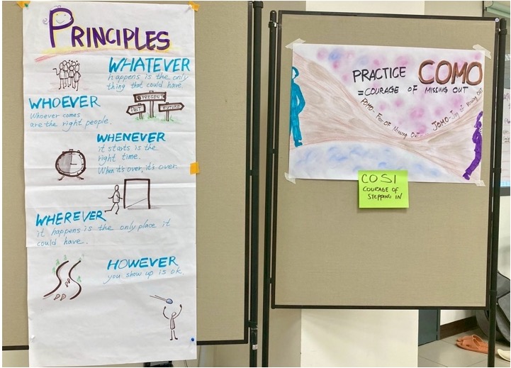 Flipping over the “Law of Two Feet” card: If you’re neither learning nor contributing in a session, use your two feet and flow to where you can. It hit me like a bell. What limited me were time, tasks, people, and familiar frameworks and methods. I am thankful for this day—it allowed me to reexamine what whatever, whoever, whenever, wherever, and however truly mean to me and my values.