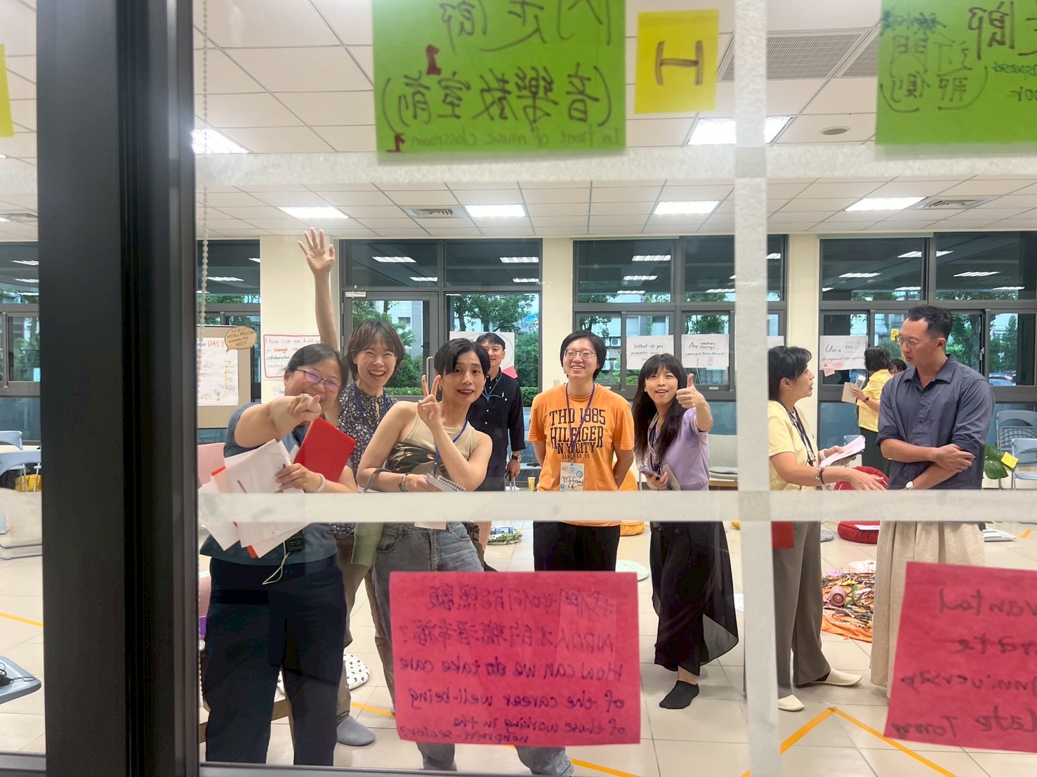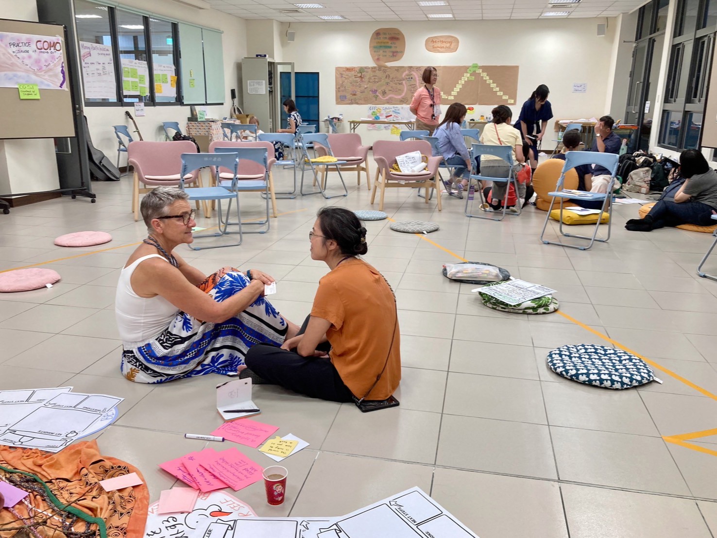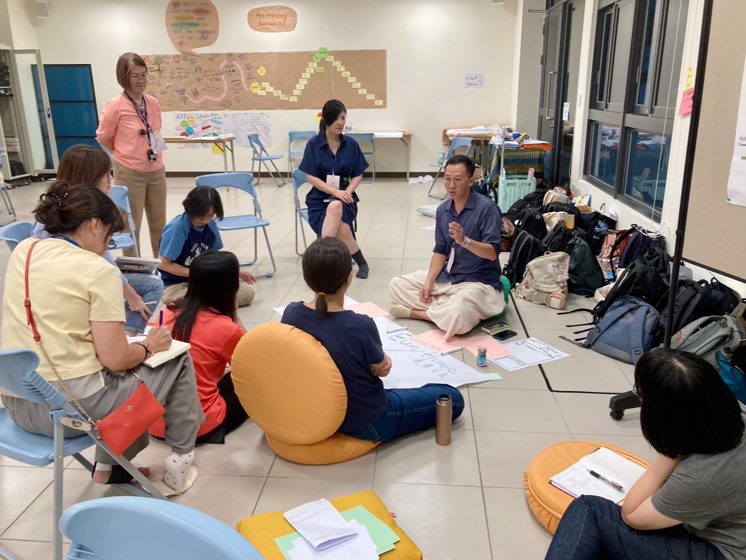 晨間的工作會議,幾個夥伴核對了上午要操作的流程,製作大蝴蝶素材的想法被接納與鼓勵,於是在課程開始前,我們就開始各自在角落忙碌著。有趣的是當天silence walk我們也都很有默契的選擇了「錯過」。