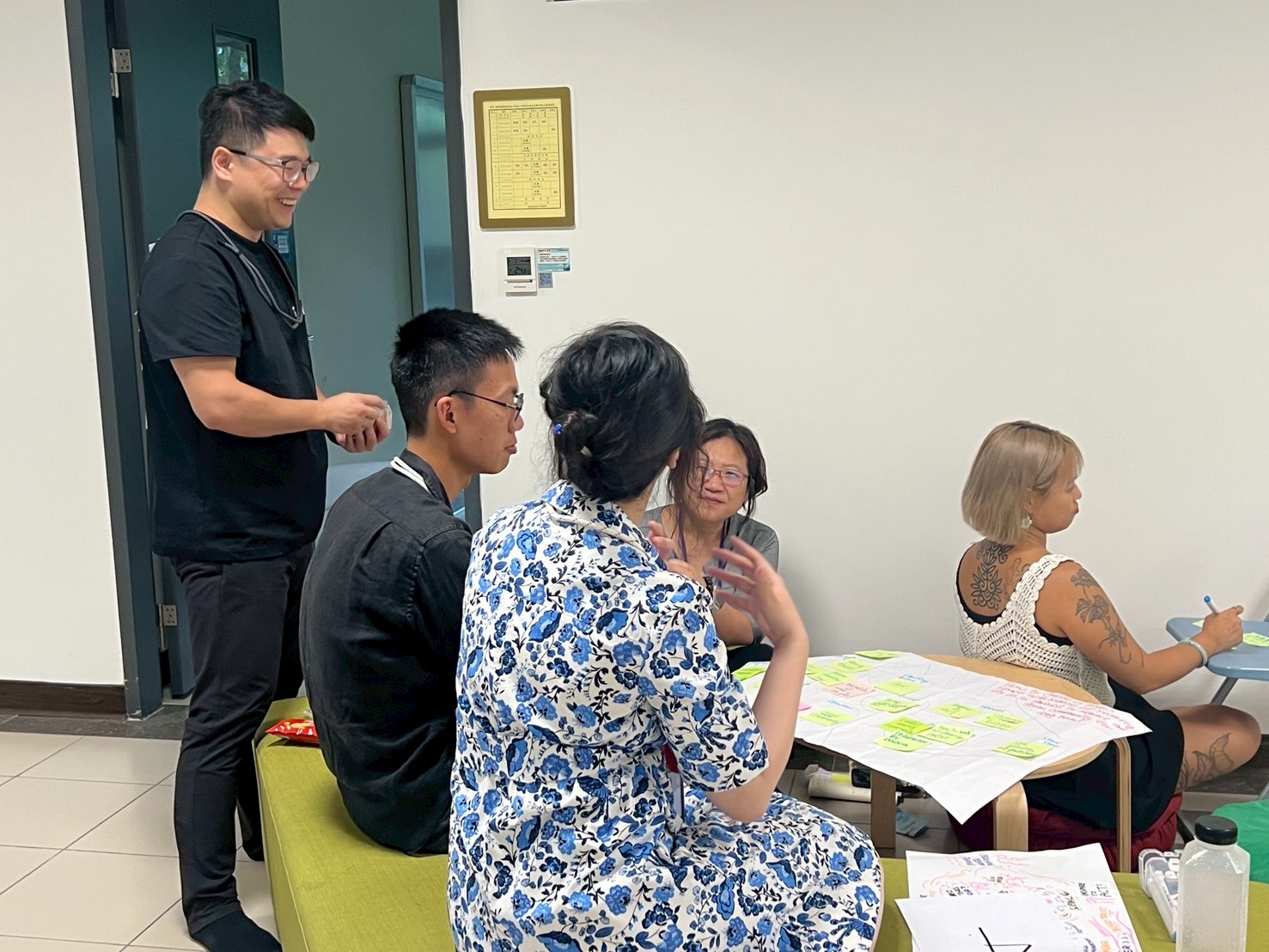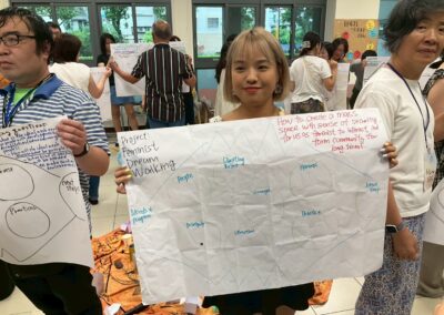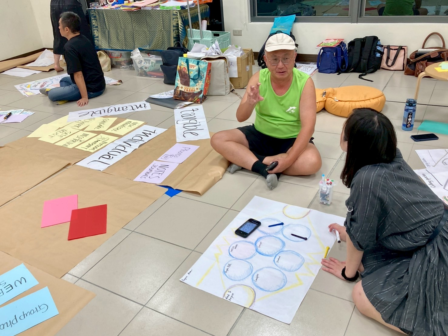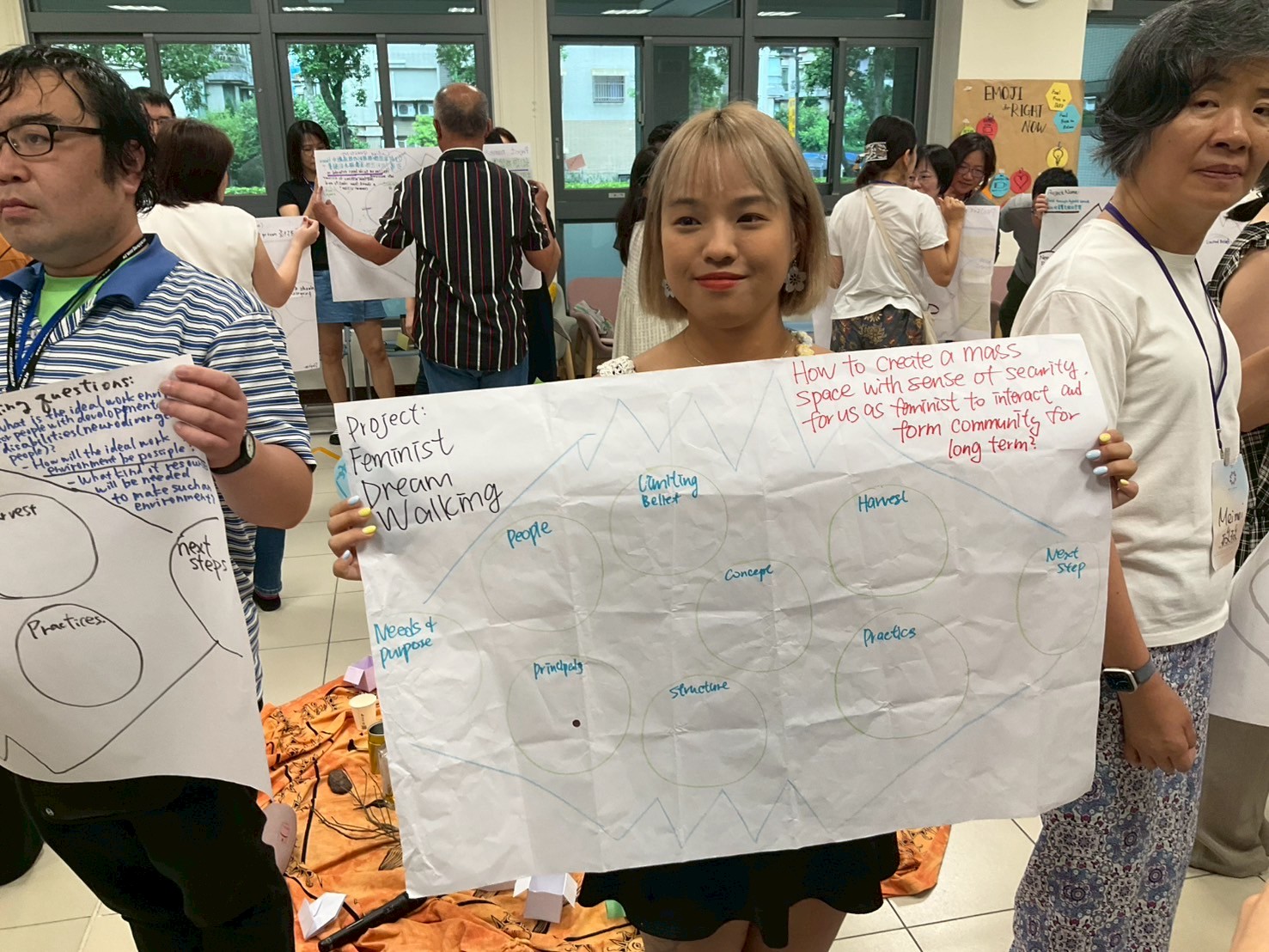 這些無形的想法,被說成具體又清晰的方法,甚至有夥伴們替我把念頭畫出來,真的很震撼,那種「把無形變成有形」的力量,是當下很深的體會。勇氣絕不是孤單一人拼搏時的力量,而是知道背後有一群真心支持你,支持你去實踐任何有益社群的活動,不管他們是否說着同樣的語言,不管她們是否在同一文化下成長。這讓我感受到自己被真正「看見」了,不只是表面上的說說而已,而是帶着深層的理解與共鳴。這種陪伴着我去經歷Chaos的感覺,好像搭建起一條橋,連接我內心的世界與其他人的集體智慧。夥伴們分享自己的見解和想法,讓我一步步理清計劃最重要的部分:女性主義的狂想,是一種創意的釋放;共聚則是用參與和接納的方法,深化社群中每個個體的連結。